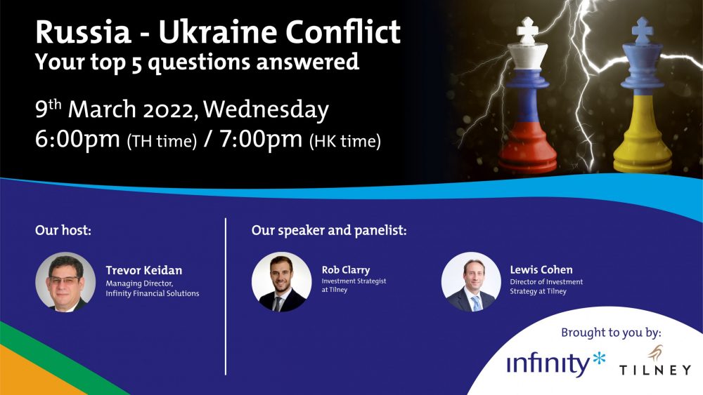 Turmoil and terror have been seen across Ukraine after the invasion by Russia. Infinity hosted this informative live webinar with Rob Clarry, Investment Strategist at Tilney and Lewis Cohen, Director of Investment Strategy at Tilney, where we answered 5 main questions regarding the Russia – Ukraine conflict, including aspects such as what the conflict may mean for your investment strategy.