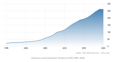 Vietnam’s economy has been on an upwards trajectory since the mid-1990s. The graph below shows steady GDP growth for the country over the last quarter century, which has made it one of the fastest expanding economies in ASEAN.
